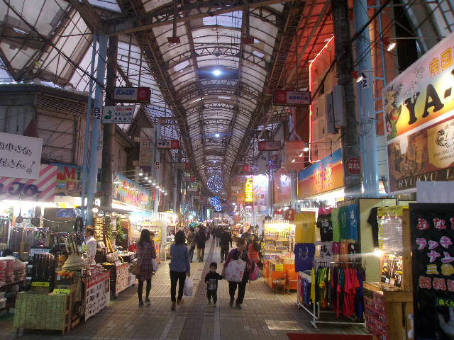那覇の商店街といえば、ローカルな風情の地元民向けの場所と、俗っぽい風情の観光客向けの場所とで大きくテイストが異なるように感じますが、ここはどちらかと言えば後者に属するかと思います。古くからの商店街の中に、無理やり電飾が飾られて観光客向けにしているテイストが逆に味わいが感じられます。ただ、国際通り程は観光地テイストが強くなく、少し裏に入ると途端にローカル色が見られる風情も平和通り界隈の特徴だと思います。