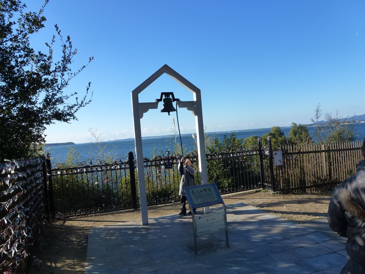 絶景のサービスエリアという言葉に誘われて、つい利用してしまいました。確かに眼下に浜名湖を見下ろす景色には素晴らしいものがあります。ふと案内板を見ると『恋人の聖地』というものがあるではありませんか。案内板に沿って歩いていくと、鐘が下がっており、そばの柵には鍵がいっぱい。思わず記念写真を撮ってしまいました。