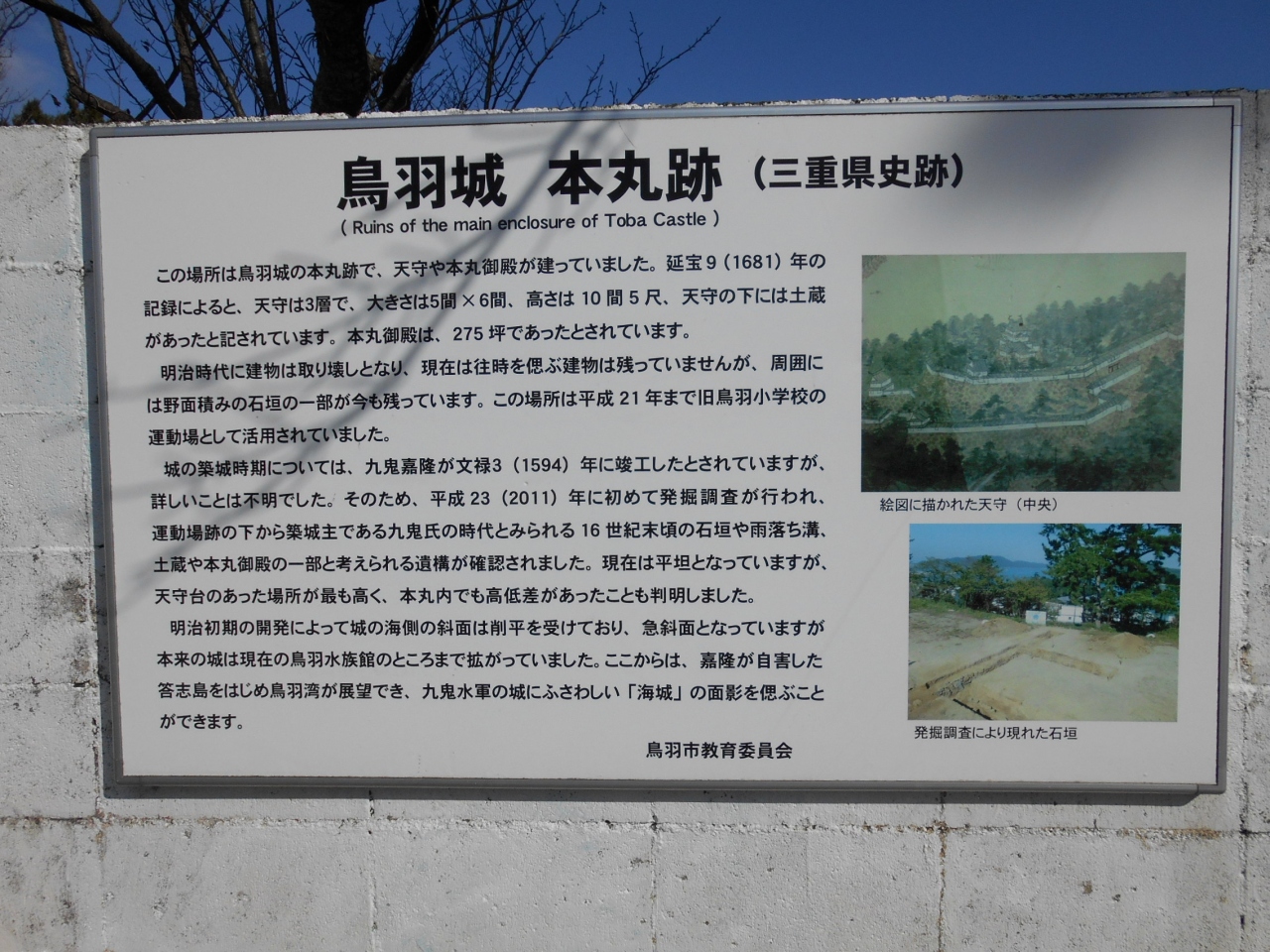鳥羽錦町郵便局近くの登り口から階段で行きました。それほど労せずに数分で本丸跡に着きました。歩道はよく整備されていて、案内表示もありました。山上からの鳥羽湾や島々の眺めは格別でした。2009年に移転した旧鳥羽小学校の校舎が残っていて、登録有形文化財に指定されていることも知りました。