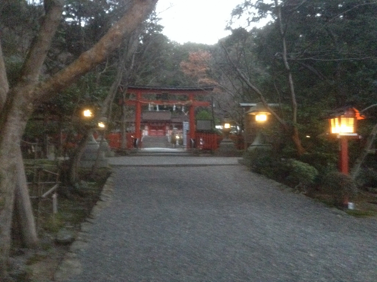 勝持寺、願徳寺を拝観した帰り、バス停まで歩いて行く途中に立ち寄りました。冬の日暮れは早く、周囲が真っ暗になった中、参道に並ぶ灯篭の灯りが綺麗でした。思ったより大きな神社で、緑豊かな境内は広く、りっぱでした。