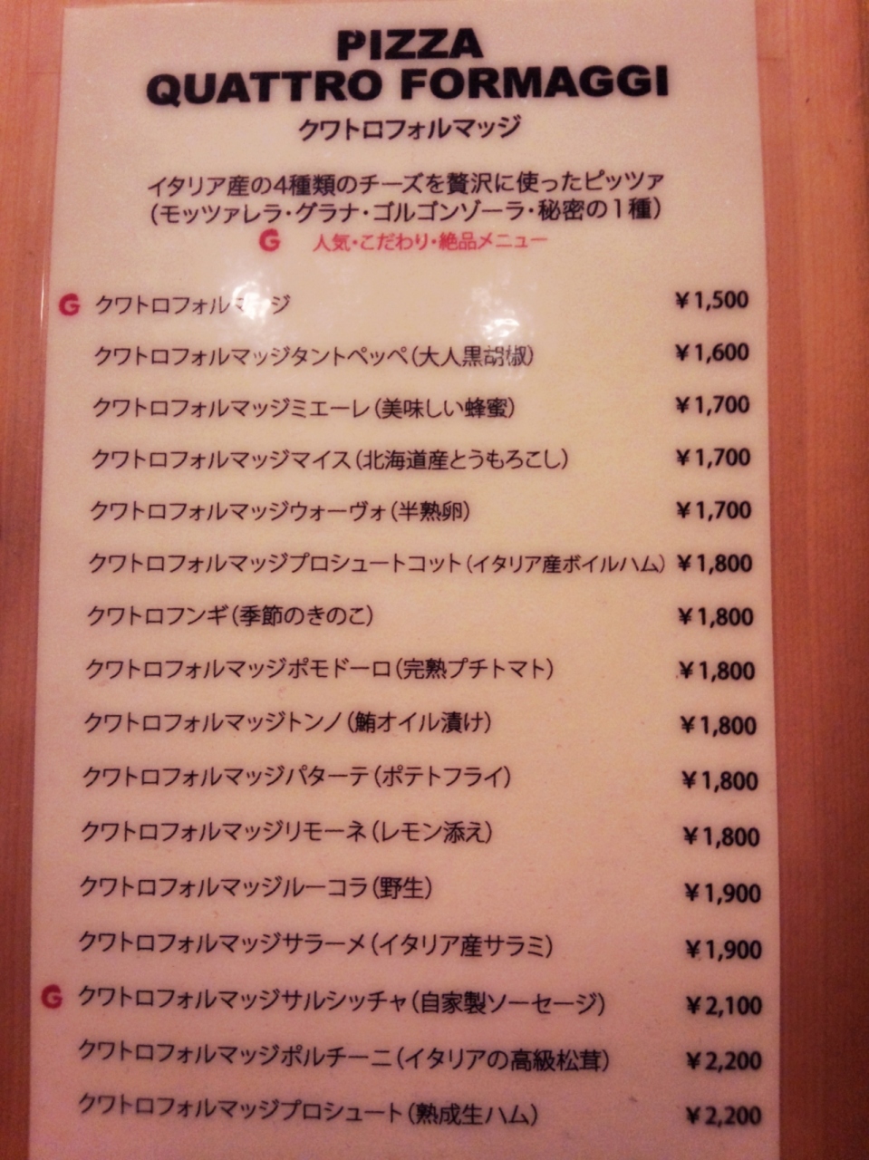 笑顔の素敵な女性店員さんに案内されて、木板を綴じたメニューをめくると…先ずはピッツア、うぉ!クアトロフォルマッジだけでこんなに!!!同じようにマルゲリータなども並びます。