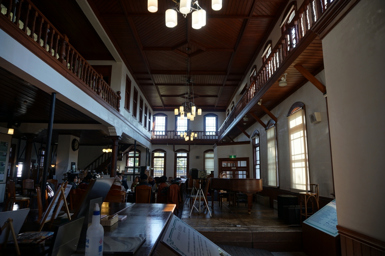 ちなみに、古賀銀行は、両替商であった古賀善平が明治18年に設立。九州の五大銀行に数えられるまでに発展しますが、大正期には業績が悪化し廃業。現在の建物は、明治39年に建てられたもの。一階から二階への大きな吹き抜けによってできた空間は、現在もある一般的な銀行店舗の感じがそのままですが、シックな木調だけに落ち着いた雰囲気。この空間を味わうだけでも価値があるように思います。