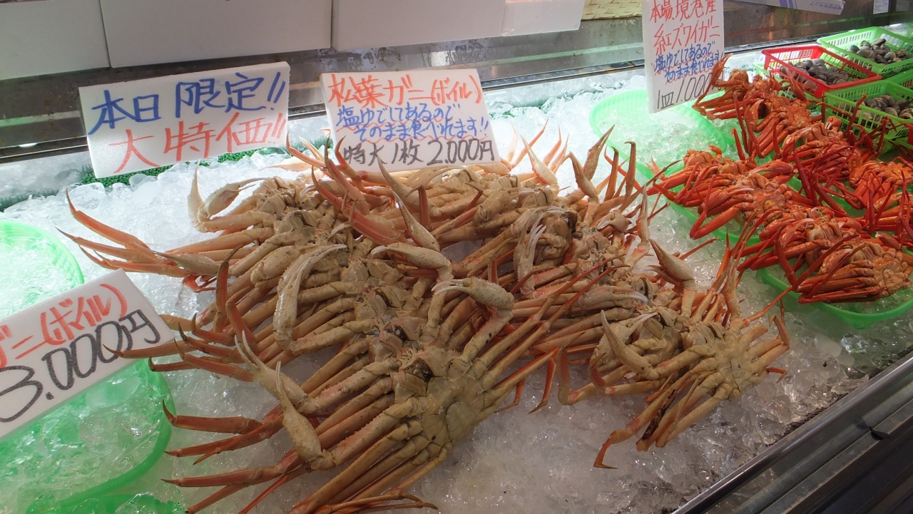 「赤碕町漁協鮮魚直売センター」では、松葉ガニ、赤貝、ドギと呼ばれるコラーゲンたっぷりのノロゲンゲ、この地でマルゴとよばれるブリの小さいも(6〜70?級、関東ではワラサと呼ばれる)、真さばなどが格安で並んでいました。