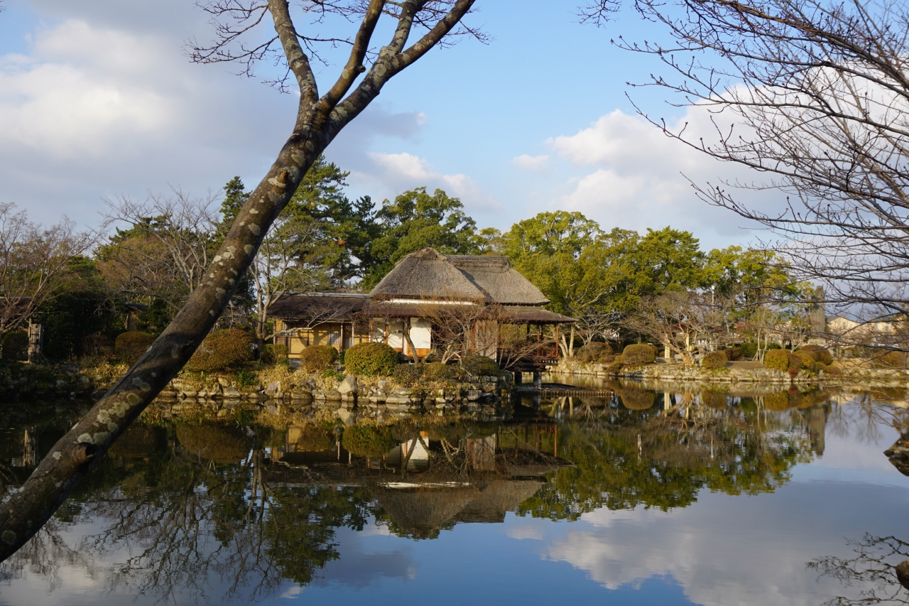 隔林亭は、神野公園の一角。佐賀藩主鍋島直正の別邸であった「神野のお茶屋」の茶室を復元したものだそうですが、周囲を広い池に囲まれて、その中にワンポイントでたたずむ姿がとても美しい。数寄屋造りの開放感あふれる建物は軽快そのもの。迎賓館の役割があったようですが、客をもてなし楽しく愉快な時を過ごすには最高の場所だったと思います。