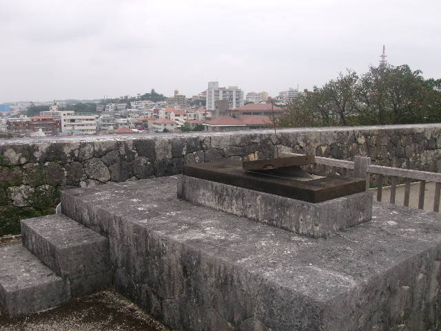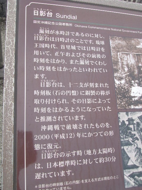 首里城の時刻を知らせる施設としては、門の名前にもなっている漏刻が有名かと思いますが、こちらは水時計であるのとは対照的に、日時計も設置されていました。それがこの日影台で、首里城の主殿から見て一段下がった北側の一角、景色の良い所に復元展示されていますので、是非探してみて下さい。
