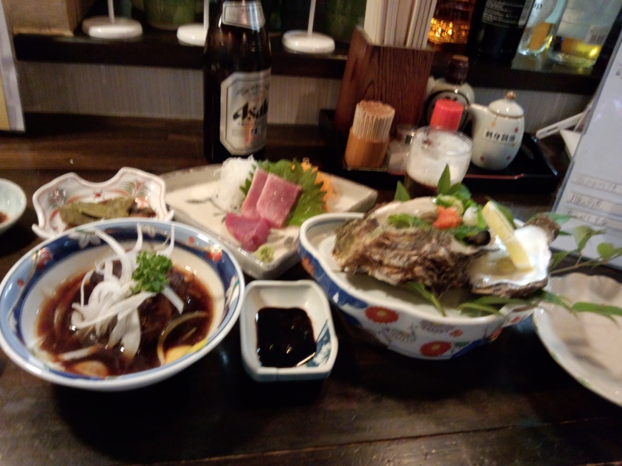ホテル近くにあった居酒屋、お店の前に「おいしさ満点、とっとりブランド!」の幟があったので夕食がてらぶらっと入りました。地酒やお刺身、岩カキなど美味しくいただきました。地酒もたくさんあってついつい飲んでしまったので一人当たりのコストパフォーマンスは高くなってしまいました。
