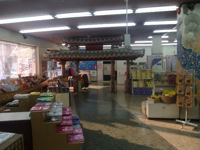 ここは商品のラインナップを見ていると一応観光客向けの施設なのかなと思うのですが、その雰囲気がとてもローカルで、ある意味味わいがあります。テーブルとイスが並んだ休憩ブースもあるので、ちょっと立ち寄って休むのにも良い所です。建物が大きい割には売り場として運用されているのは1Fだけという感じでしたが、その売り場内に守礼門のレプリカがあって驚かされました。