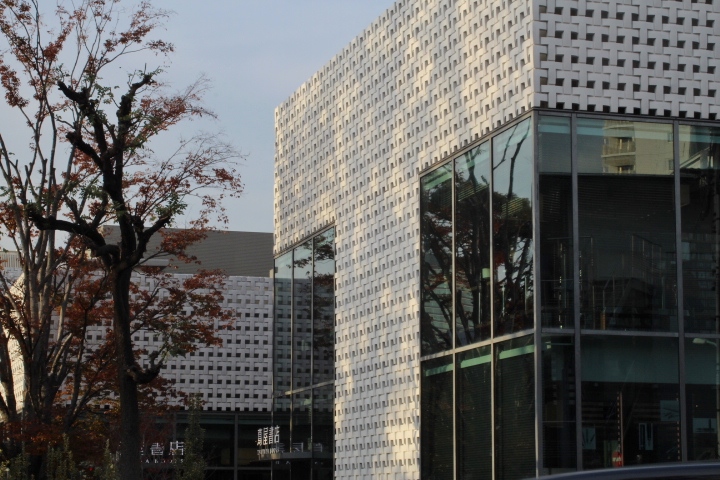 代官山に行くとT-SITEに立ち寄ることが多いのですが、書店、DVD・CDレンタル、飲食と揃っているので待ち合わせ場所としても重宝しています。建物の外壁は蔦屋のイニシャルであるT形の磁器?を組み合わせてあり、おまけに側面はT形になるようにガラス窓を大きくとっています。