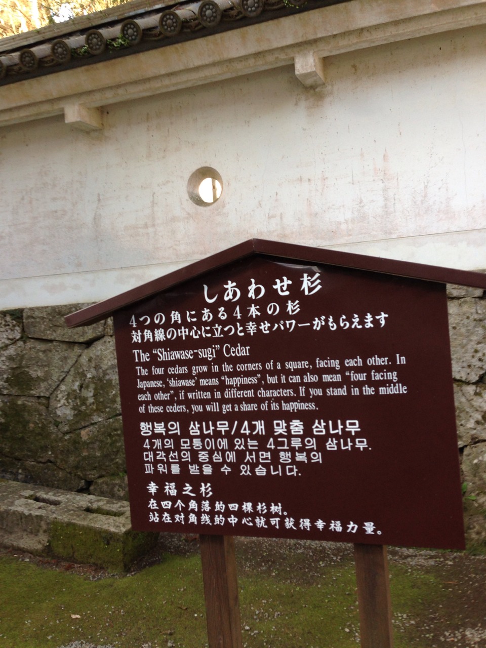その後、階段を上って行きます。途中、幸せの四本の杉があり、真ん中に立つと幸せになれると書いてあったので、もちろん立ってみました^^ ただ、真ん中に印みたいなものはないので、かなりアバウトに、何となくここかなというところに立ちました。