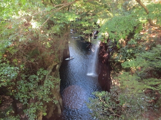 高千穂峡は、高さ80m~100mの断崖が7kmにわたり続いた渓谷で名勝・天然記念物に指定されています。一方通行の山道をクネクネと下り進むと、T字路に看板があり左に曲がると真名井の滝に真名井の滝に近い御塩井駐車場(500円)は平日でも満車と書いてあったので右に進み、高千穂峡あららぎ駐車場(300円)に止めました。駐車場は平日でも満車に近く紅葉のシーズンはもっと混みそうです。真名井の滝の滝から少し離れた場所にでしたが駐車料金も安いし遊歩道を散策できるので体力があればお勧めです。 真名井の滝はテレビで見る景色と一緒でとてもいい景色でした。ボートで漕いでいる人がたくさんいて滝をくぐろうとして押し返されていてとても楽しそうでした。