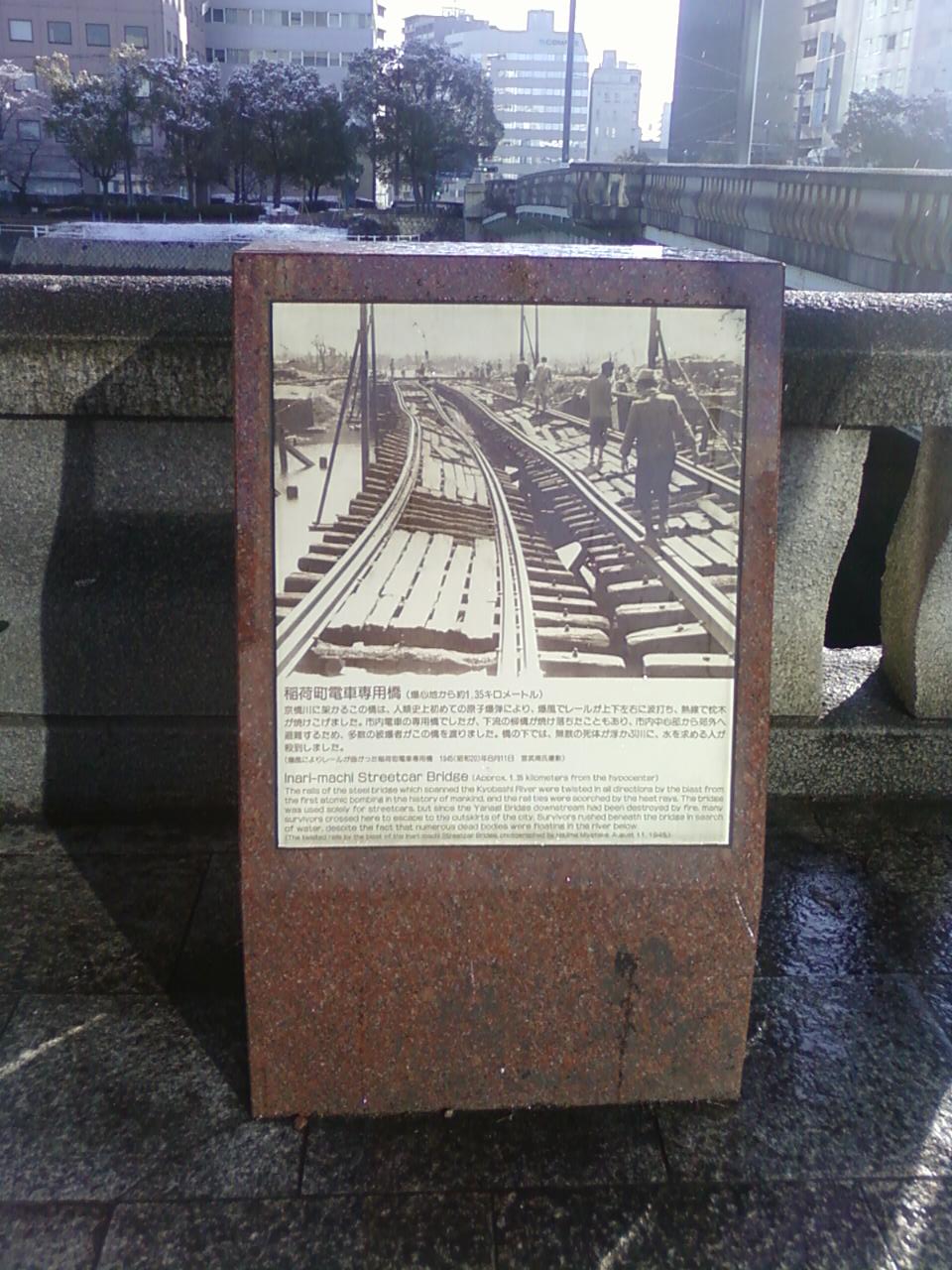 京橋川は川の多い広島の中でも駅から徒歩圏内の川です。京橋が架かっていて、かつては、稲荷町電車専用橋もかかっていました。電車用の橋でしたが、被爆者たちがそこを渡って避難していったそうです。そして無数の被爆者が当時は川にあふれていたそうです。ここにも原爆の爪あとを感じるものが残っていました。