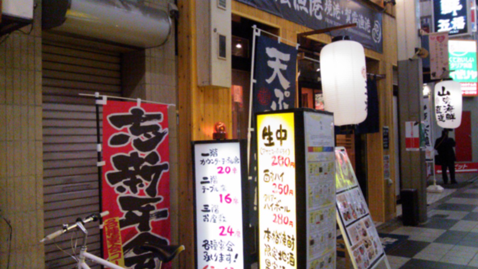 お初天神への参道らしく、アーケードには垂れ幕や提灯が飾られ、夜はとても賑やかになります。
