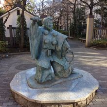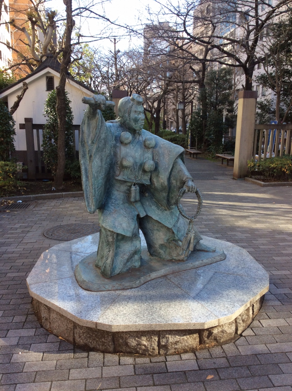 甘酒横丁を明治座の方に進んで行く途中にある、昔の浜町川跡に出来た浜町緑道の所にあります。歌舞伎発祥地を記念して建てられました。名前の勧進帳とは、武蔵坊弁慶の勧進帳読上げで有名な、能の演目を基にした歌舞伎の代表作のひとつです。