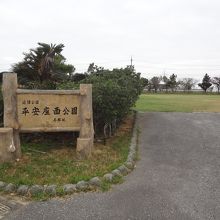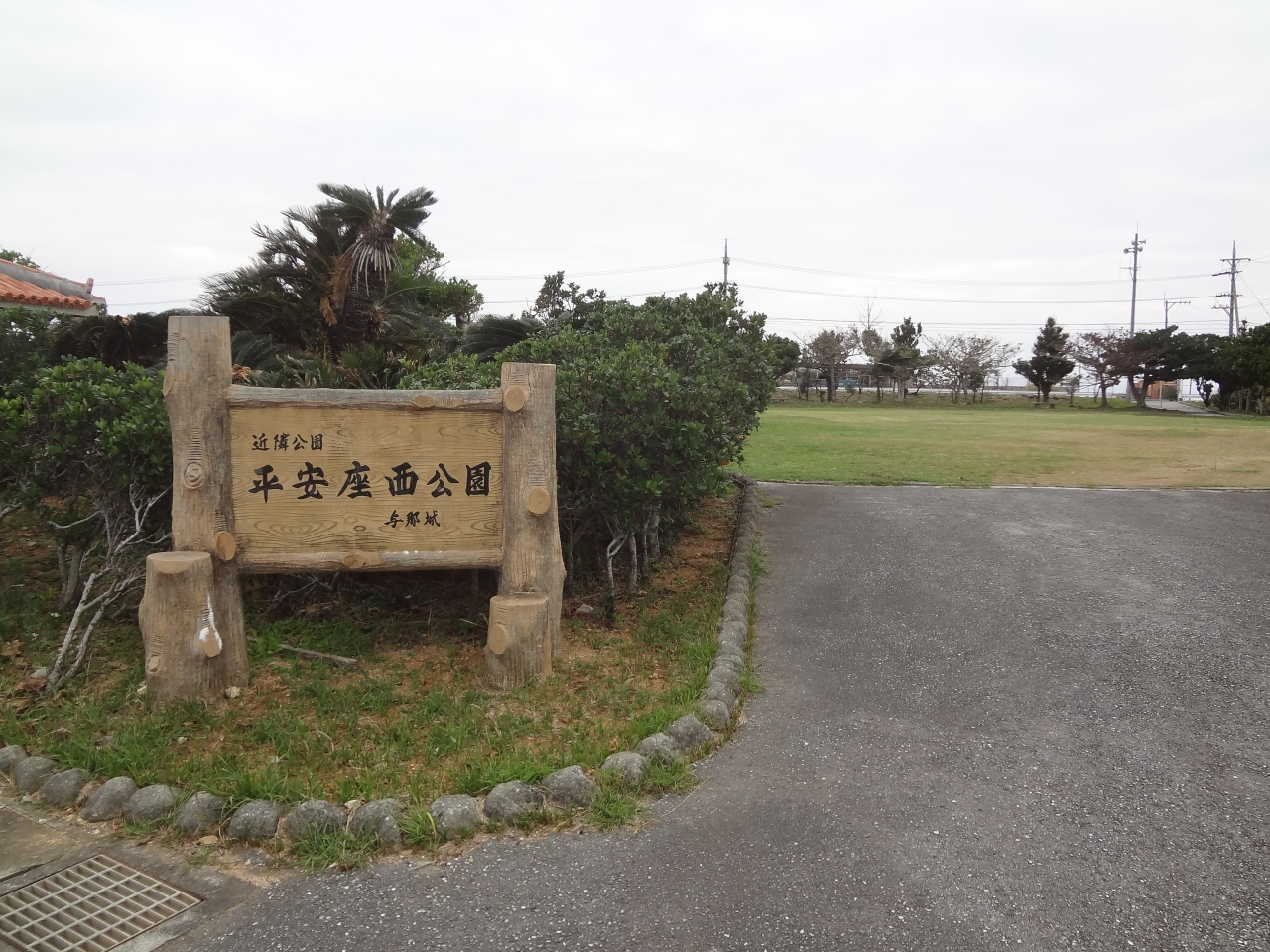 平安座島にある芝生のきれいな公園でした。シーズンオフの1月だったので公園内には誰もいませんでしたが、芝刈りの作業員が機械でその芝を刈っていました。園内の一部には遊戯施設があり、他にも屋根が付いたテーブル席がひとつ、トイレもありました。