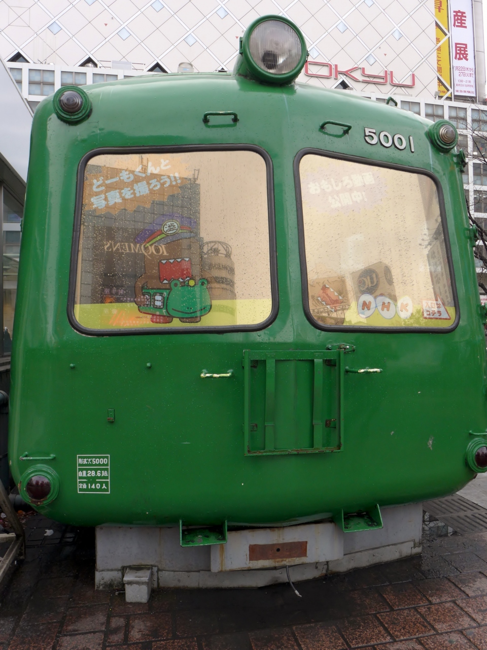案内所として使われているのは東急電鉄の5000系の車両で、緑色の塗装と下ぶくれの愛嬌ある車体から「青ガエル」と呼ばれていたそうです。