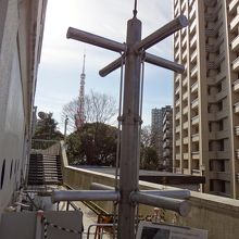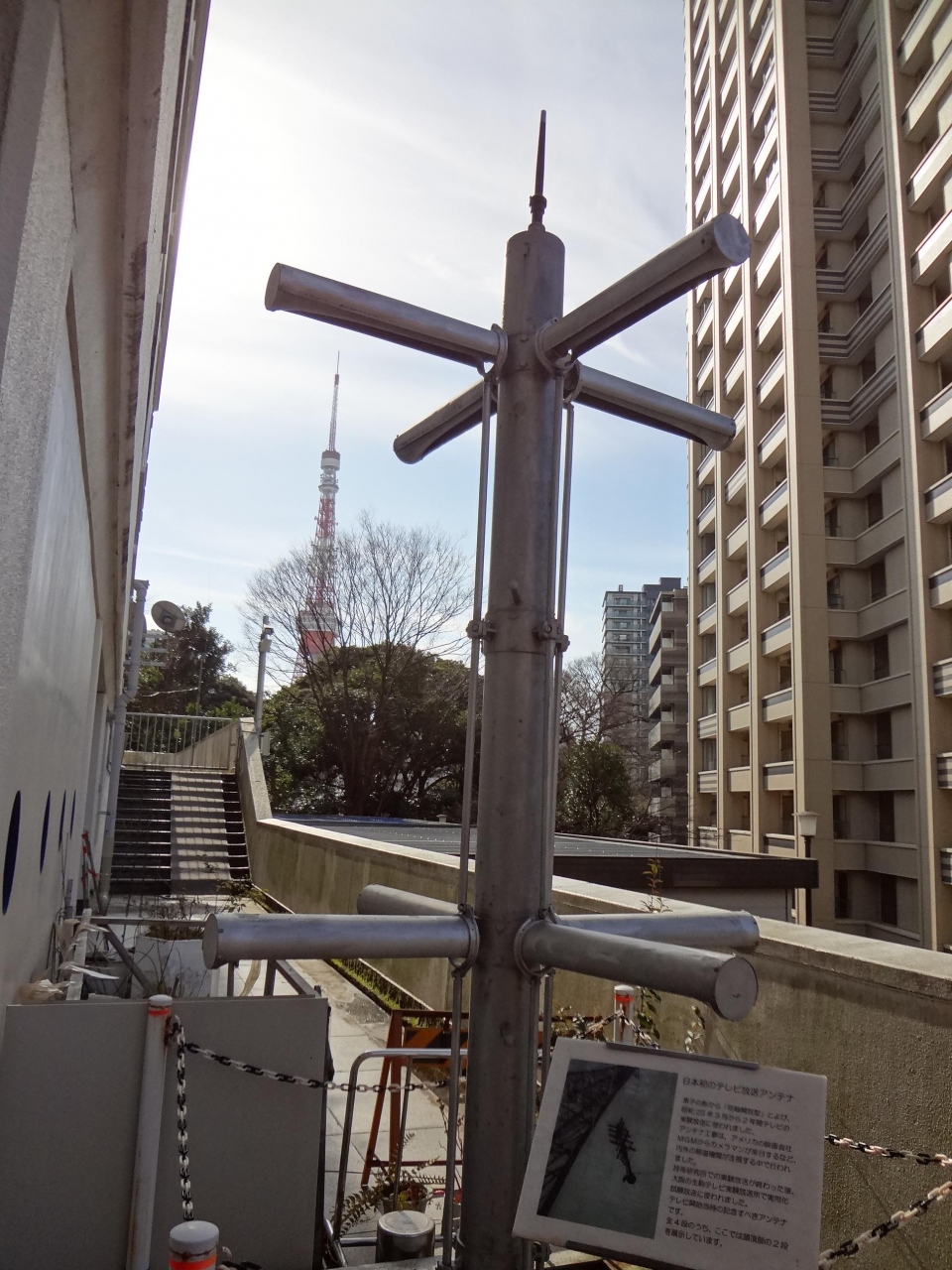 愛宕神社、参拝を終えて、左手に行くとNHkの放送技術センターがあります。センター内には、放送博物館があり、放送の歴史、特に技術的な歴史について学ぶことができます。博物館の前には、アンテナが展示されています。東京タワーをバックに、放送開始当初のアンテナを見ることができます。