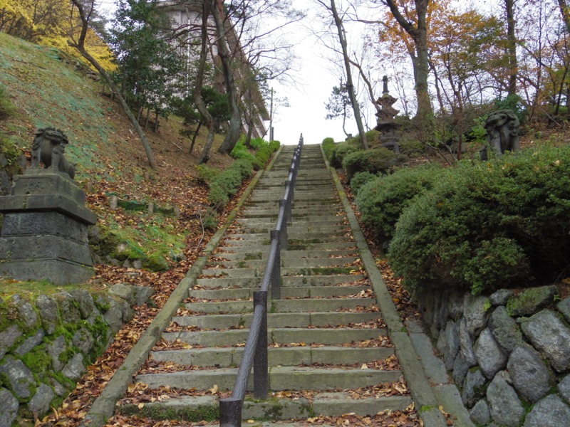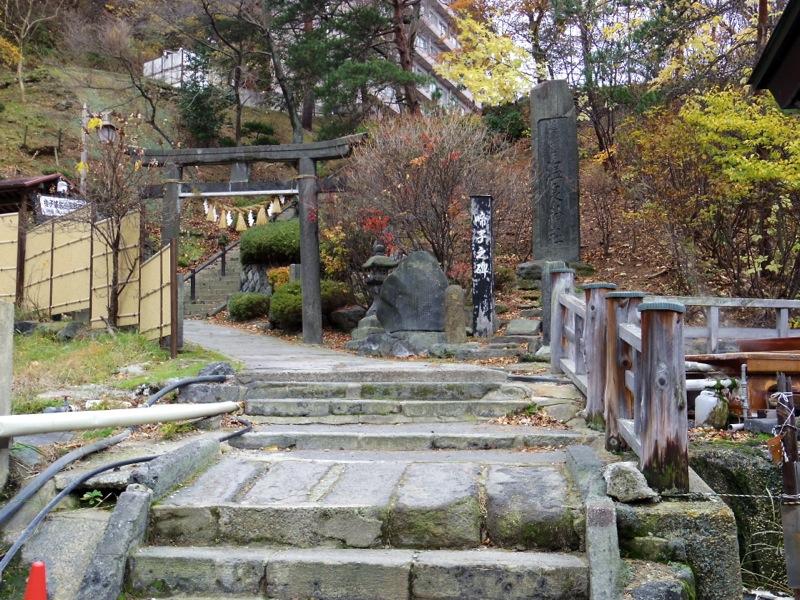 鳥屋ヶ森山の噴火(826年)により、温泉神社から温泉が湧出し始めたのが鳴子温泉の始まりとのこと。共同浴場「滝の湯」はこちらのの源泉(御神湯)を引いています。滝の湯の建物のすぐ裏手から階段がのびています。