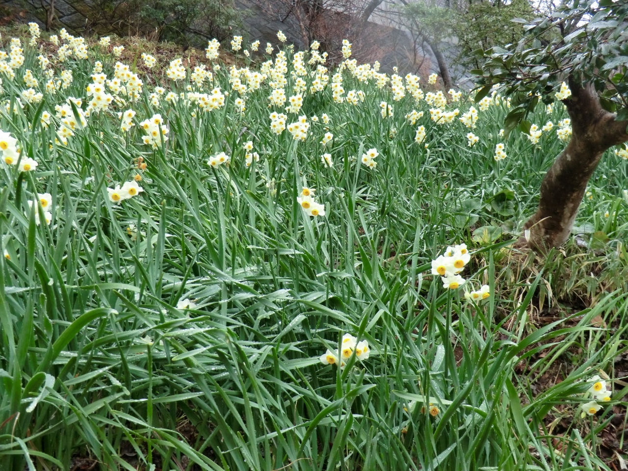 見られた花はスイセン、菜の花、バラ等がポツリポツリ。時期的に仕方ないと思いますが、雨が降っていたこともあり一段と寂しい感じでした。