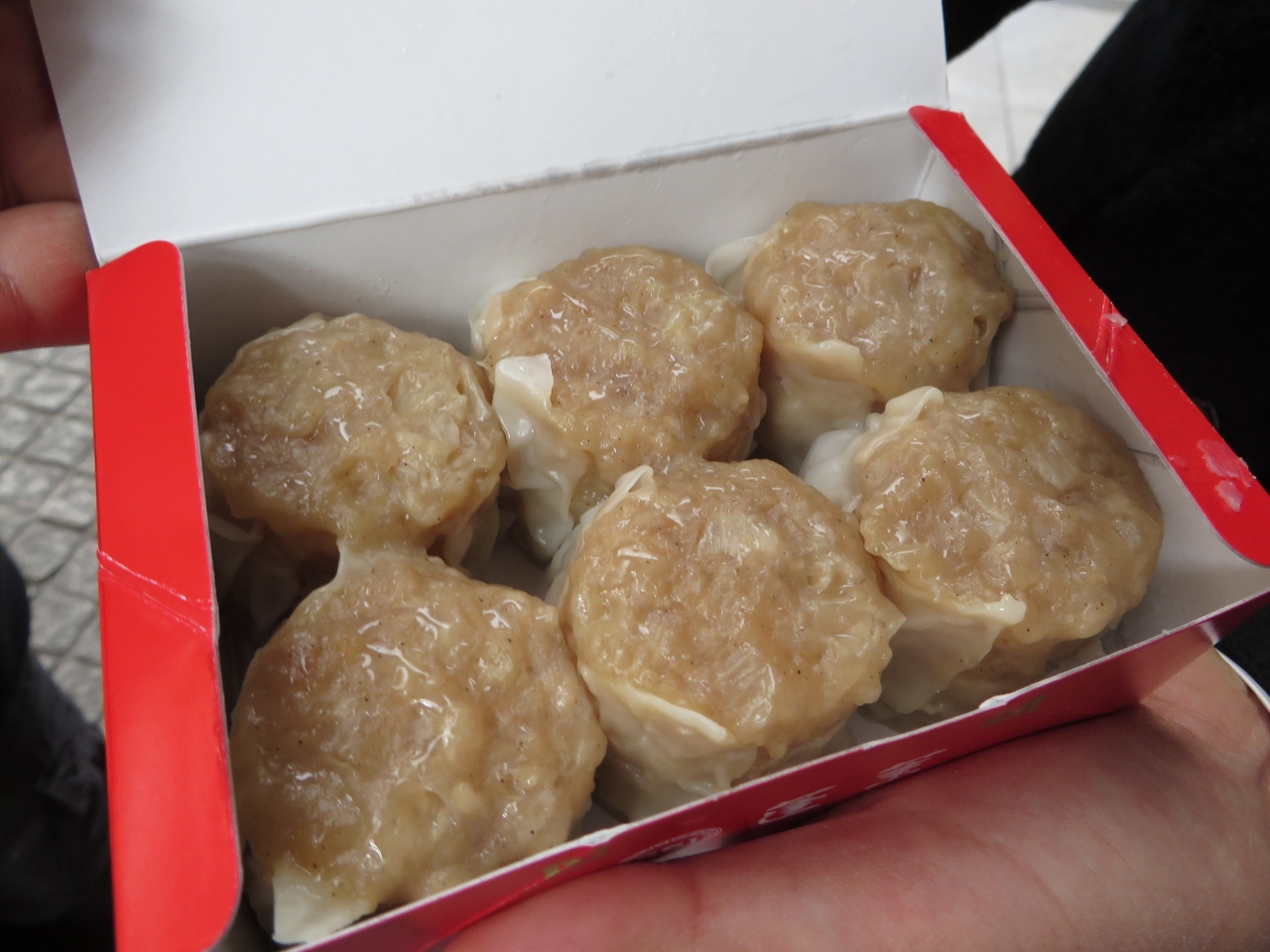 昼過ぎに、行列に10分程度並んで、豚マンとシュウマイを買い、路地上で食べました。まず買い方ですが、宅配お土産用、店舗内、店舗外の3つの買い方があります。次に味ですが、豚マンもシュウマイも美味しいです。横浜中華街の味と値段を基準にすると、価格は安く、味もそこそこという評価でしょう。