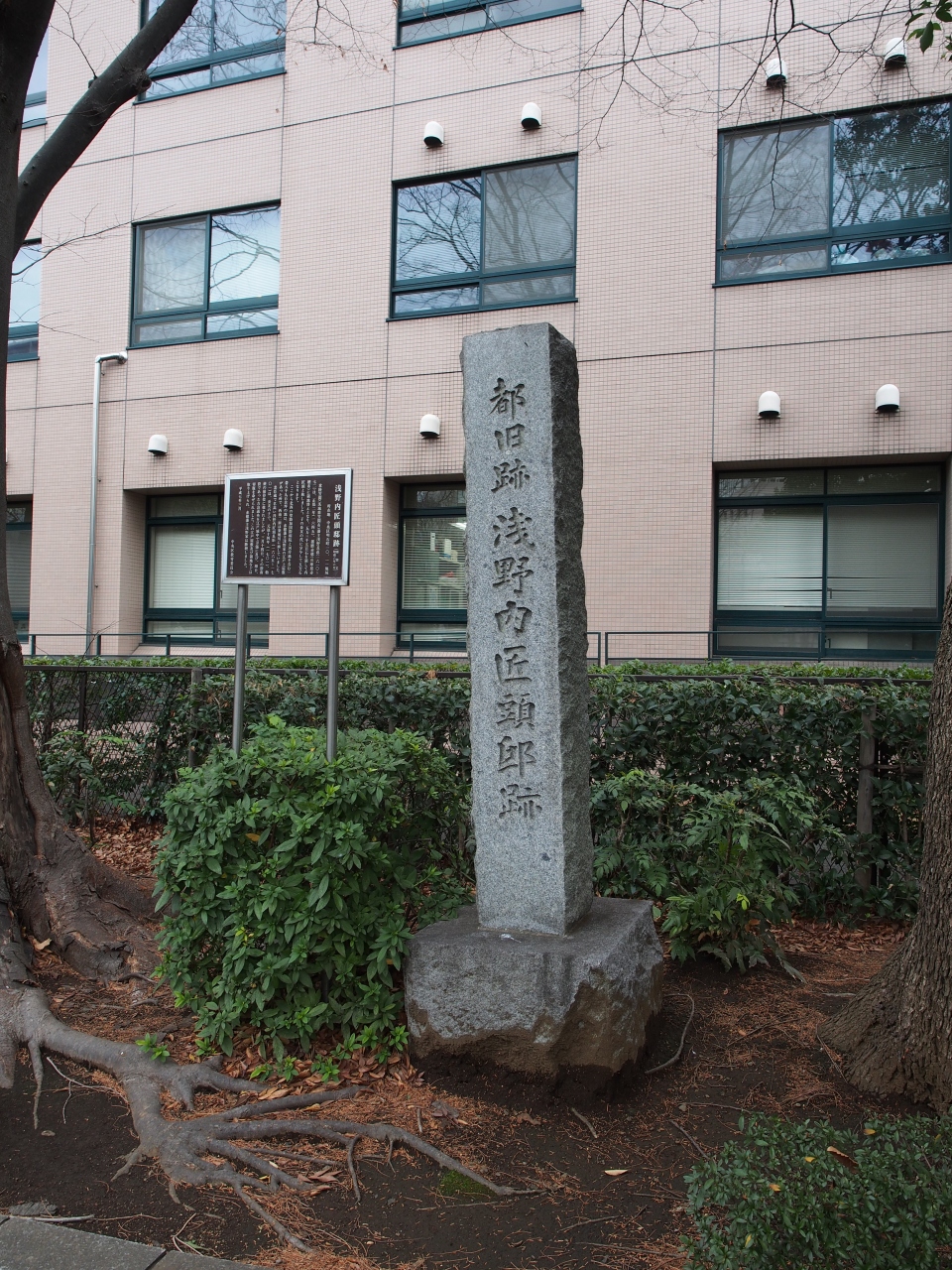 赤穂浪士で有名な浅野内匠頭の邸がここにあったそうです。屋敷の名残はありませんが、赤穂浪士つながりだと近くの本願寺に浪士の一人の供養塔があるので一緒にまわってみるのもいいかもしれません。