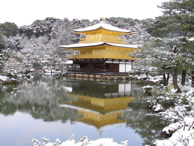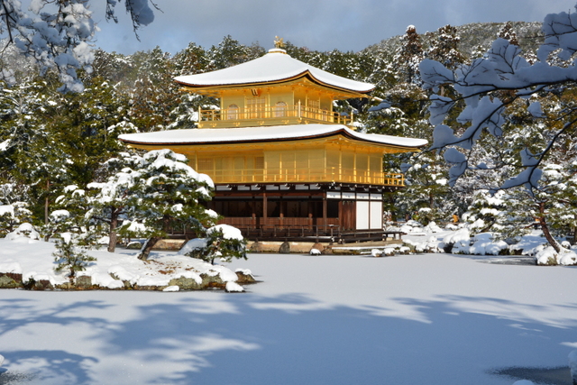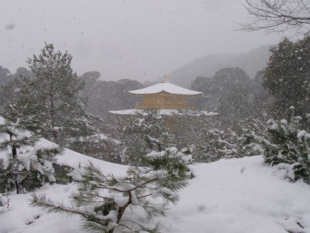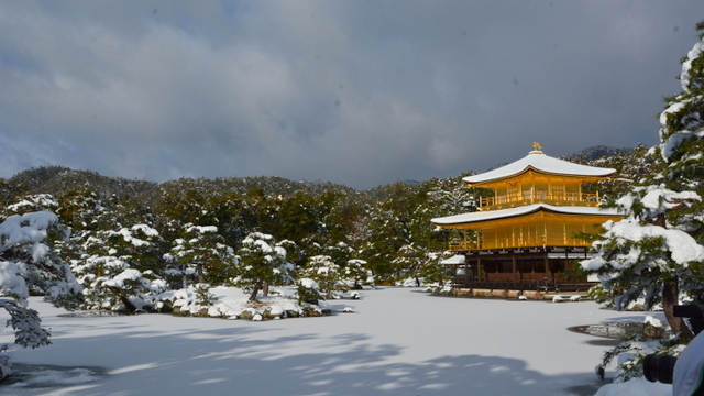 いつもだと逆さ金閣が映る鏡湖池も凍り一面雪景色の中の金閣