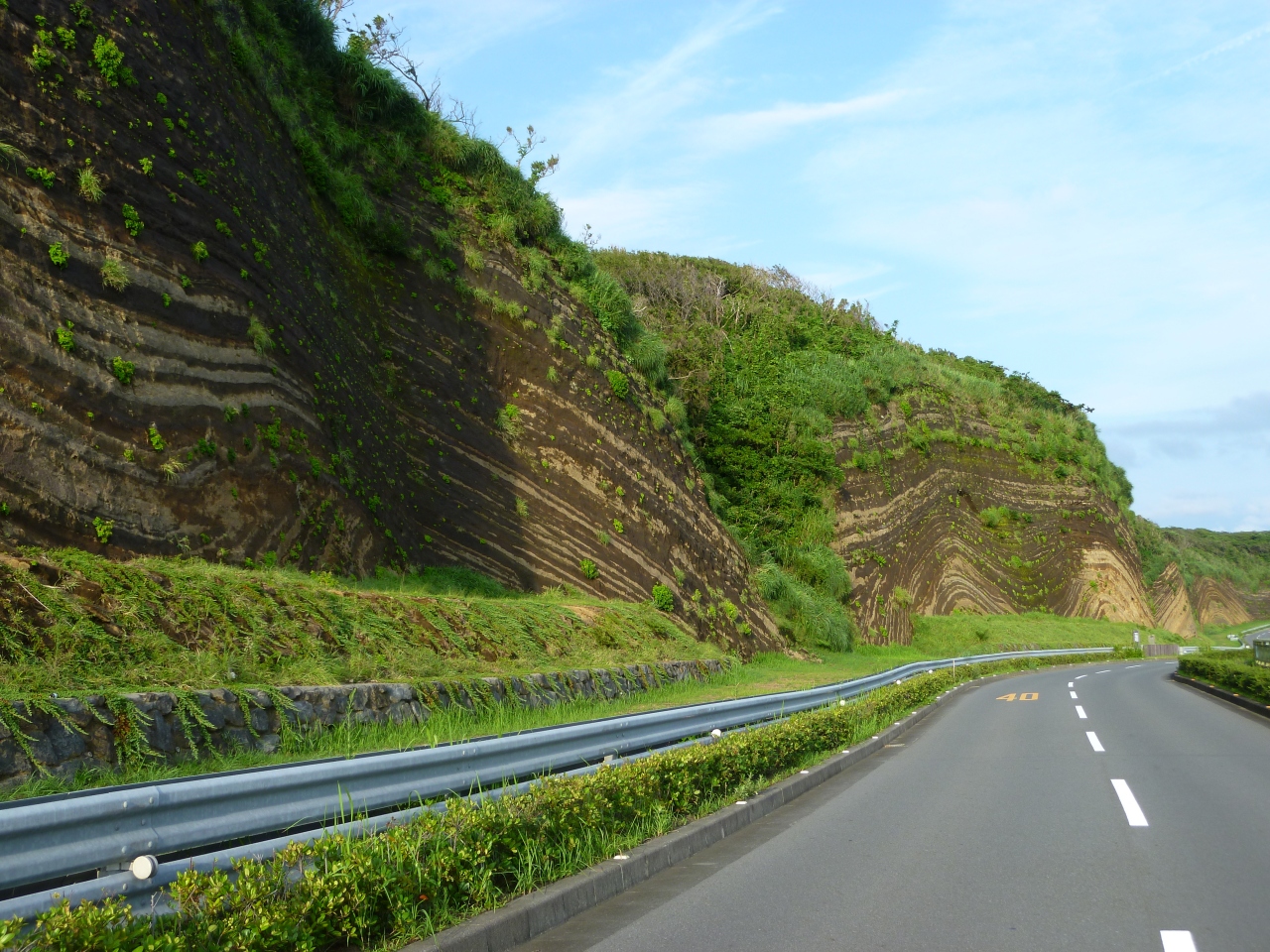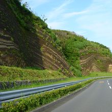 波浮から元町へ行く外周道路を元町方面へ向かうと右側に地層の見える切りとおしが見えてきます。地層が褶曲している様子がとても良く見えます。1kmほどに渡って切りとおしになっています。道路工事で地層が見えるようになったそうです。地層と反対側に駐車スペースがあるので路肩駐車せず安全に見て欲しいです。