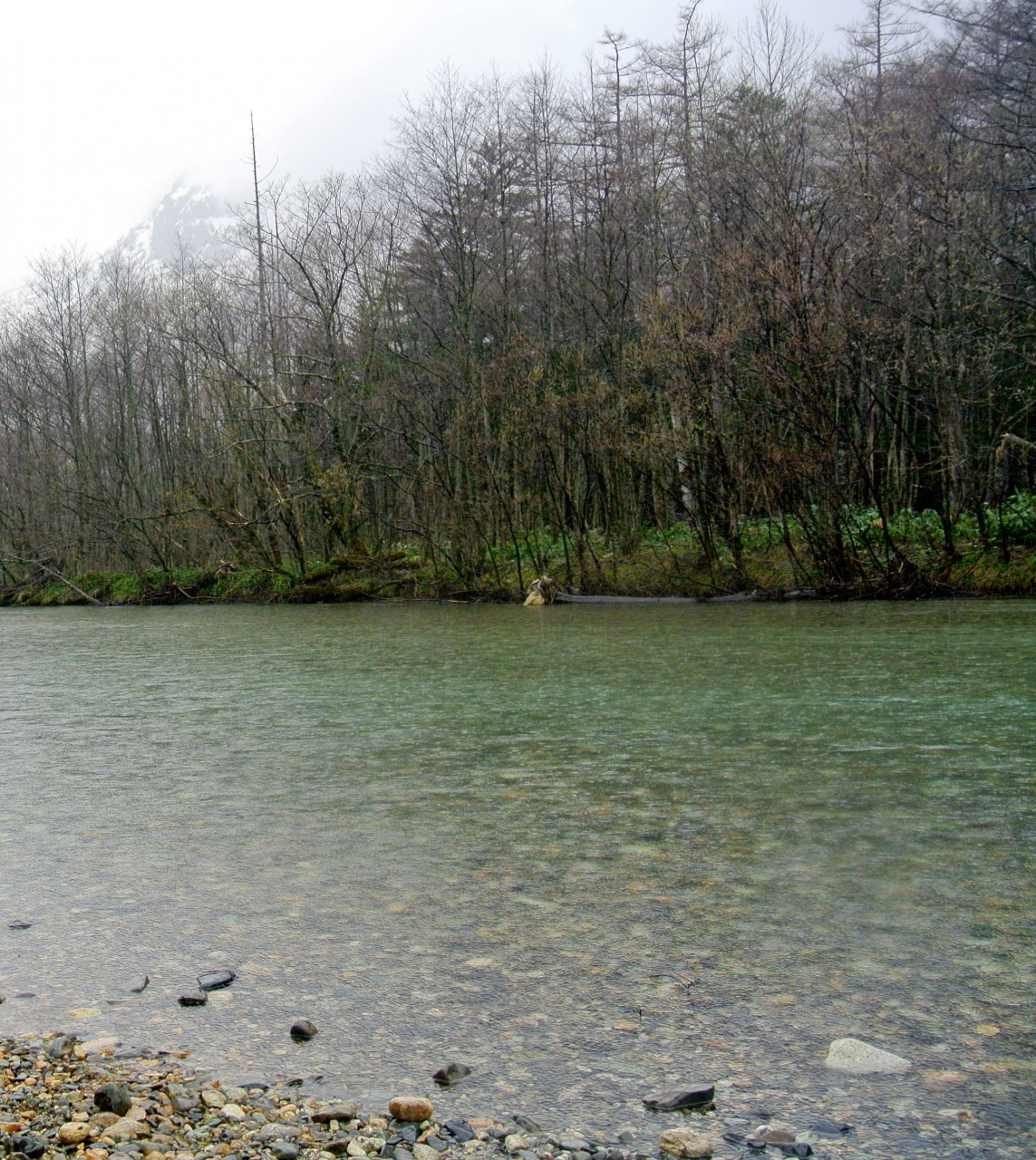 遊歩道で梓川の川岸まで出ることができるルートがあります。清流と呼ぶにふさわしい透明度でした。川の水に手をひたしてみましたが、もちろん冷たかったです。河原や川の底は大き目の石からなっています。梓川の水はここより下流では水力発電に利用されています。