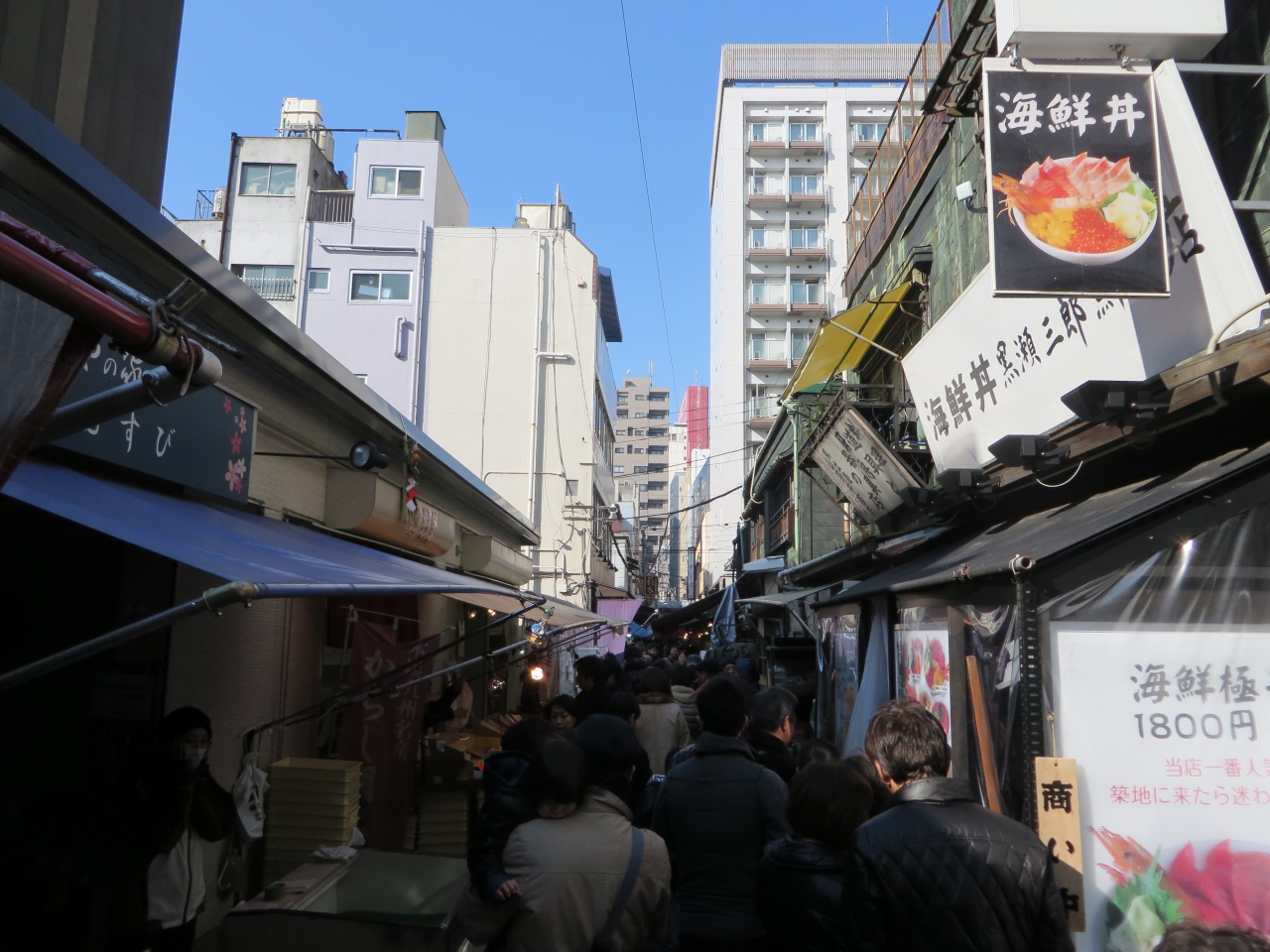 平日と12月30日の2回、築地場外市場を観光しました。平日でもかなりの人出で、多くの観光客でごった返していました。2回とも寿司をランチ(\1,200と\3,780)を食べましたが、はやり値段によって、ネタのクオリティに大きな差が出ます。また双方共に卵焼きが付いていました。