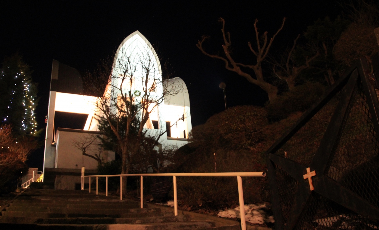 元町地区の教会が夜はライトアップされると聞き行ってみました。聖ヨハネ教会は形がとてもモダンでユニーク。白い建物は函館山からも良く見えましたが、実際行ってみると静寂の中に光に照らされ幻想的でした。ちょうどクリスマス時期だったので、イエス生誕の様子を再現した飾りがステキでした。