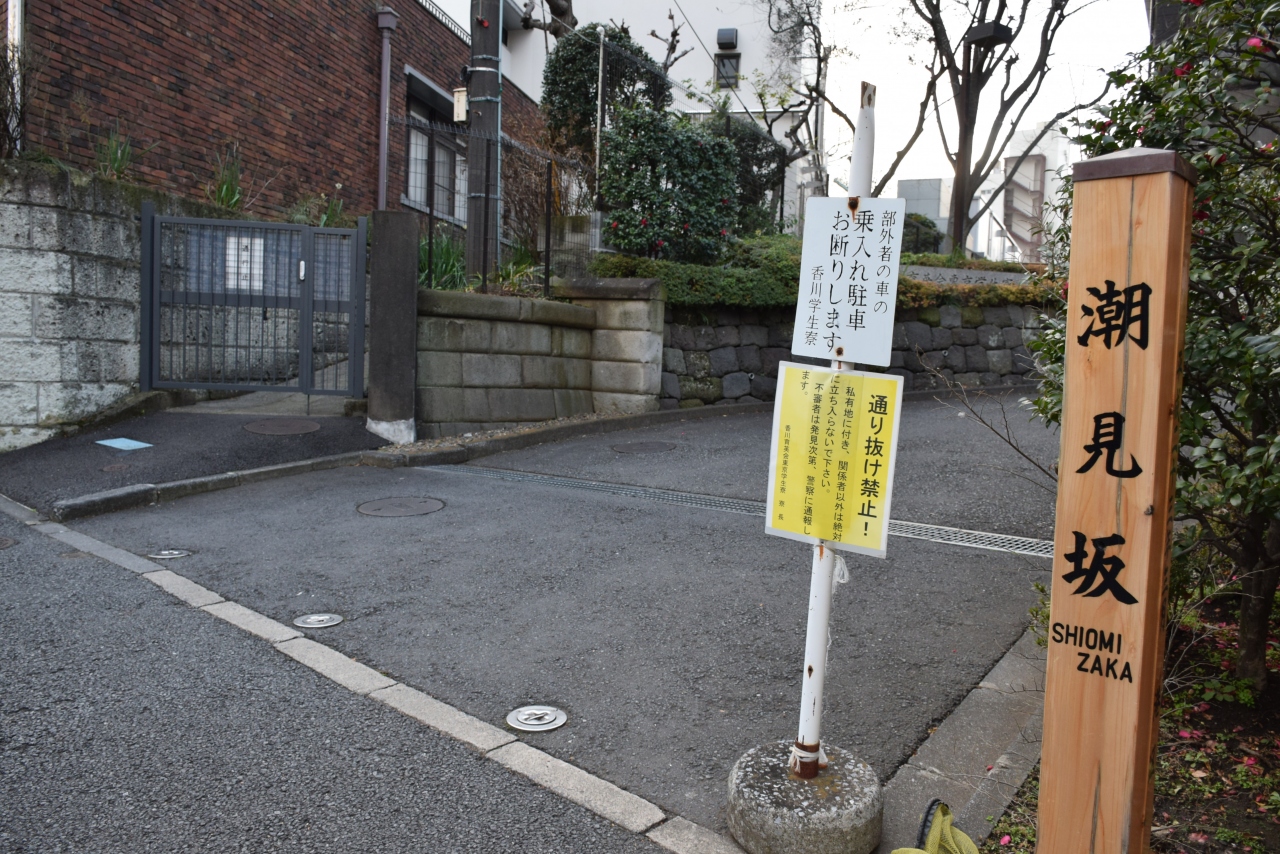 高輪の台地の北側、三田方面から安全寺坂を上がりきり、左に曲がると、標識が見えてきます。それによると、「坂上から芝浦の海辺一帯を見渡し、潮の干満を知ることができたためこの名がつけられた」とあります。近くには普連土学園があります。