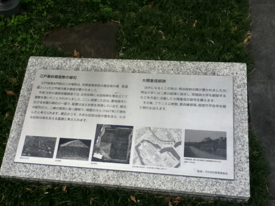 地下鉄九段下駅の南東、千代田区役所の中にある。庁舎の前には芝生が敷かれ竹が所々立っていて、そこにこちらの礎石と説明板がある。礎石は、柱や壁をしっかり支えられそうな石のように見えた。数人が休憩していたが、これらを見ている人はいなく静かであった。この場所は、将軍直属家臣の居住地や蔵、馬場、厩等江戸城の施設が置かれていて、最近の遺跡発掘調査では、近世初頭に水田地帯を埋め立てて屋敷を築いたことが確認された。特に遺跡やこの界隈に関心や知識がある方には、訪問することをお勧めする。