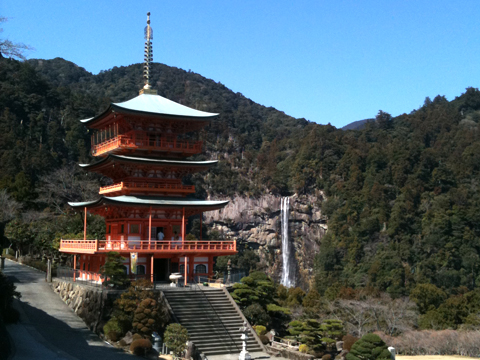 那智の滝を背に、朱塗りの三重塔がとてもうつくしいんです。