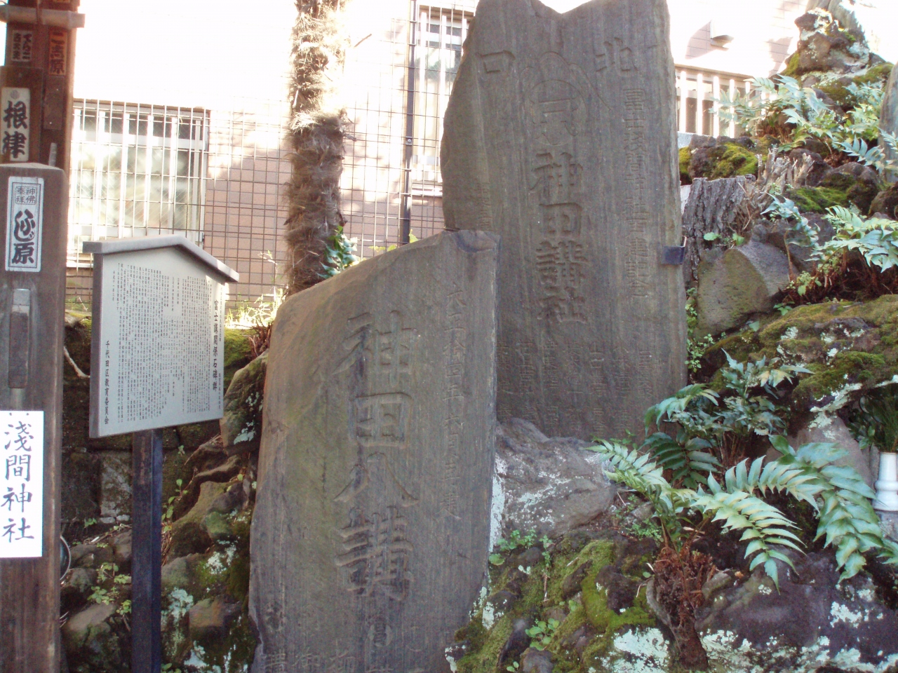 JR秋葉原駅電気街口から神田ふれあい橋で神田川を渡り左折すると柳森神社に、通りから柳森神社の境内に入ってすぐの右手に大きな富士講関係石碑群があります。富士講関係石碑群は江戸時代に富士山参拝・浅間信仰のための集まりが柳森神社近くで作られたと案内板に記されてます。