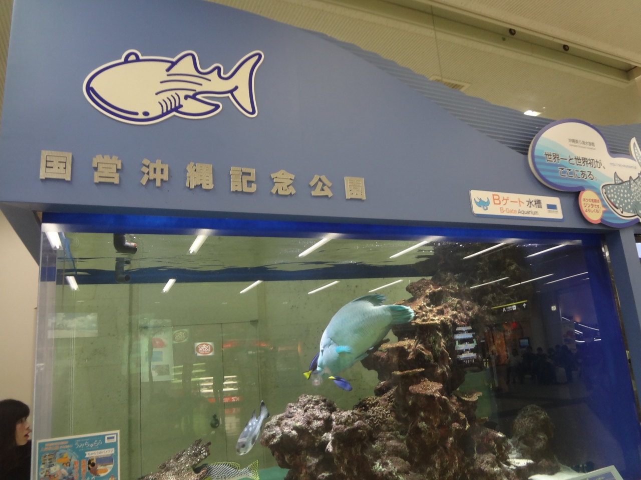 ちゅら海水族館で有名な沖縄ですが、那覇空港にも1階の到着ロビーに国営沖縄記念公園の水槽が置いてあります。規模は比較にならないほど小さいものですが、面白い魚もいるので一見の価値はあるかと思います。特に面白いのがメガネモチノウオという種類の魚です。ブルー系の身体と顔に特徴があり、ゆったりと泳ぐ姿がなんとも優雅です。