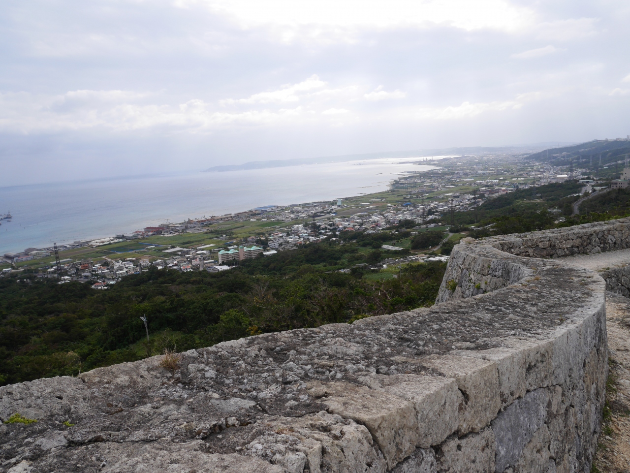 沖縄本島の東西に細い部分の山にあるため、石垣に登ると、東と西の両側に海が見え、絶景です。。。海は。