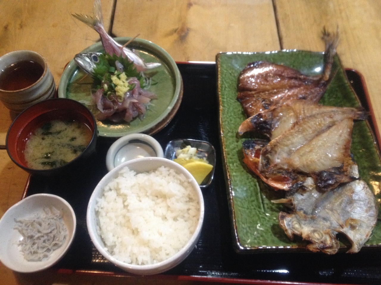 昼は干物定食や海鮮丼、鯵のタタキのお茶漬けがありました。金目鯛の煮付けがおいしいらしいですが3000円で手が出ず…、食べたことのない金目鯛の干物に。欲張りメニューの3種類干物がついている上に鯵のたたき付きに。脂がのっておいしかったですがいくらこぶりでもさすがに3種類は多かったです。鯵のたたきは臭みは全くなく新鮮でした。タタキなしは600円安いです。