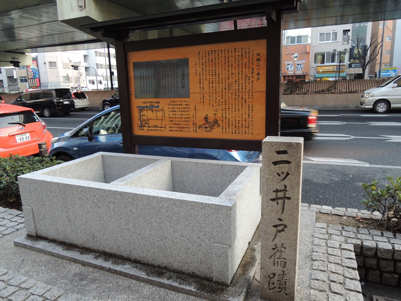 国立文楽劇場前の歩道に平成24年に復元された「二ツ井戸」は説明版もキレイでした。