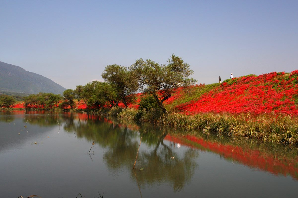 その河川敷の一部は一面のヒガンバナで埋め尽くされます。時期が合えば見事み赤く染まった堤防を眺めることができます。
