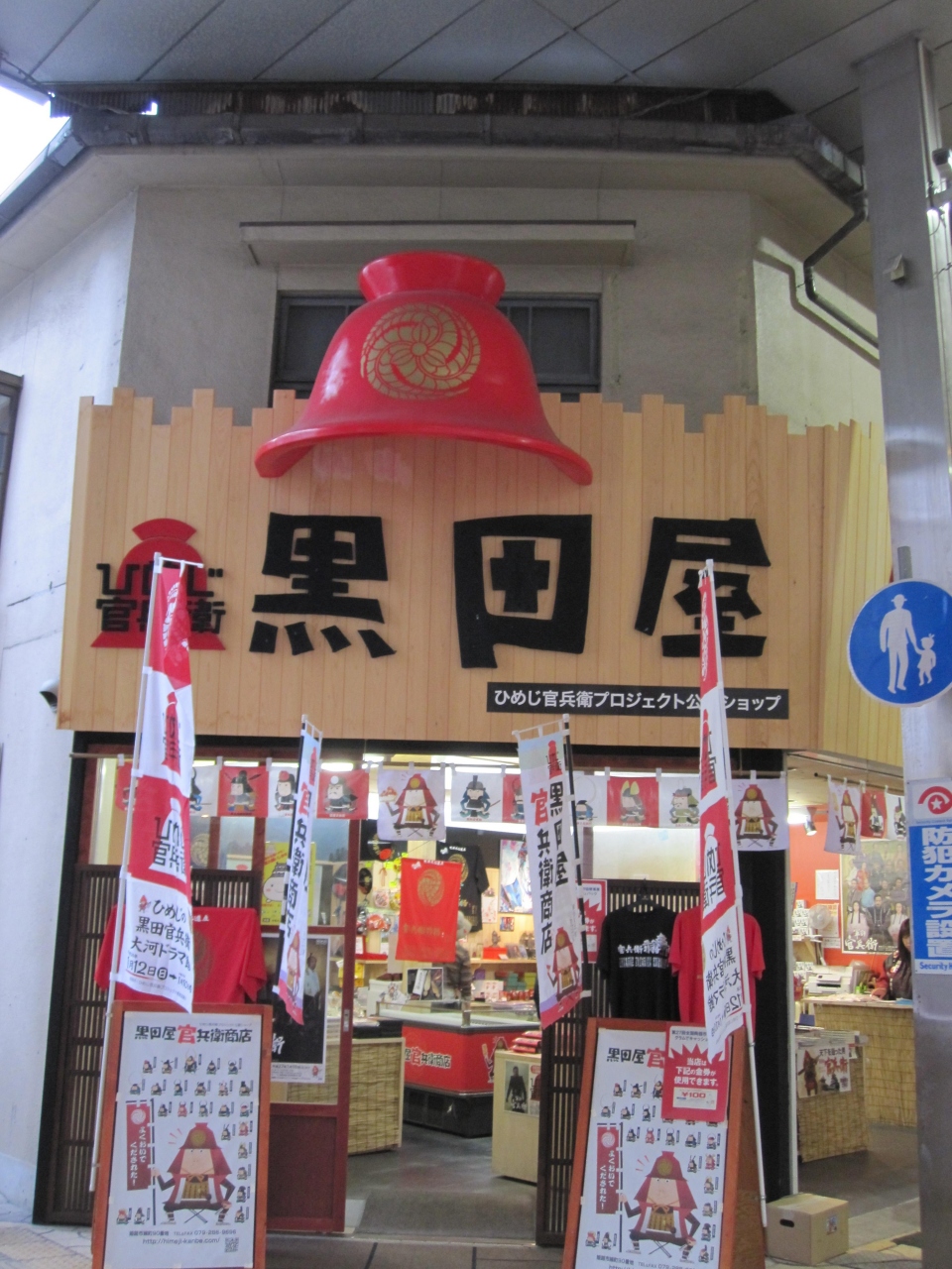 姫路駅から姫路城方面に向かう、みゆき通りにある大河ドラマ「軍師官兵衛」のお土産を売っているお店です。ゆるキャラかんべえくんと姫路市のゆるキャラしろまるひめとのコラボ商品もありました。店内はそれほど広くなかったです。