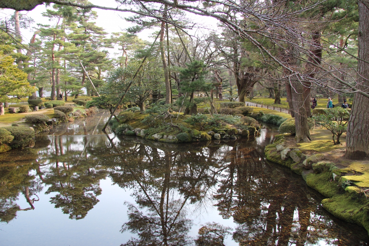 兼六園内を縫うように曲水の豊かな水が流れていて、景色に変化をつけています。兼六園は高台にありますが、金沢城の防火用水として造られた辰巳用水を利用しているそうです。桜とカキツバタの咲く時期が特にいい景色のようです。そのころにまた来たいものです。