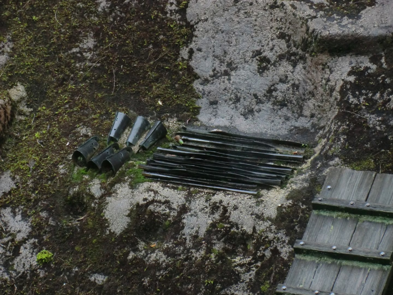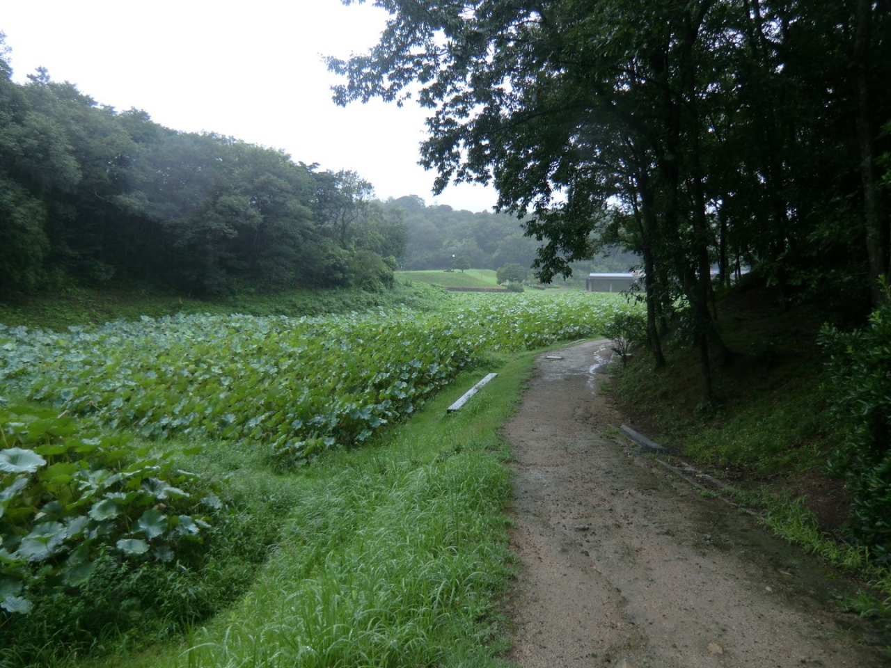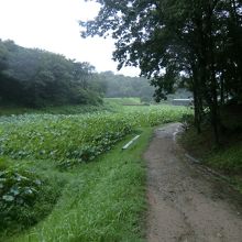 駐車場から資料館の脇を通り、ハスの畑の傍を歩き、少し林の中に入った斜面に遺跡はあります。想像していた風景とは異なり、静かな所に遺跡があり、出土した状態でレプリカで再現されている。