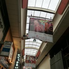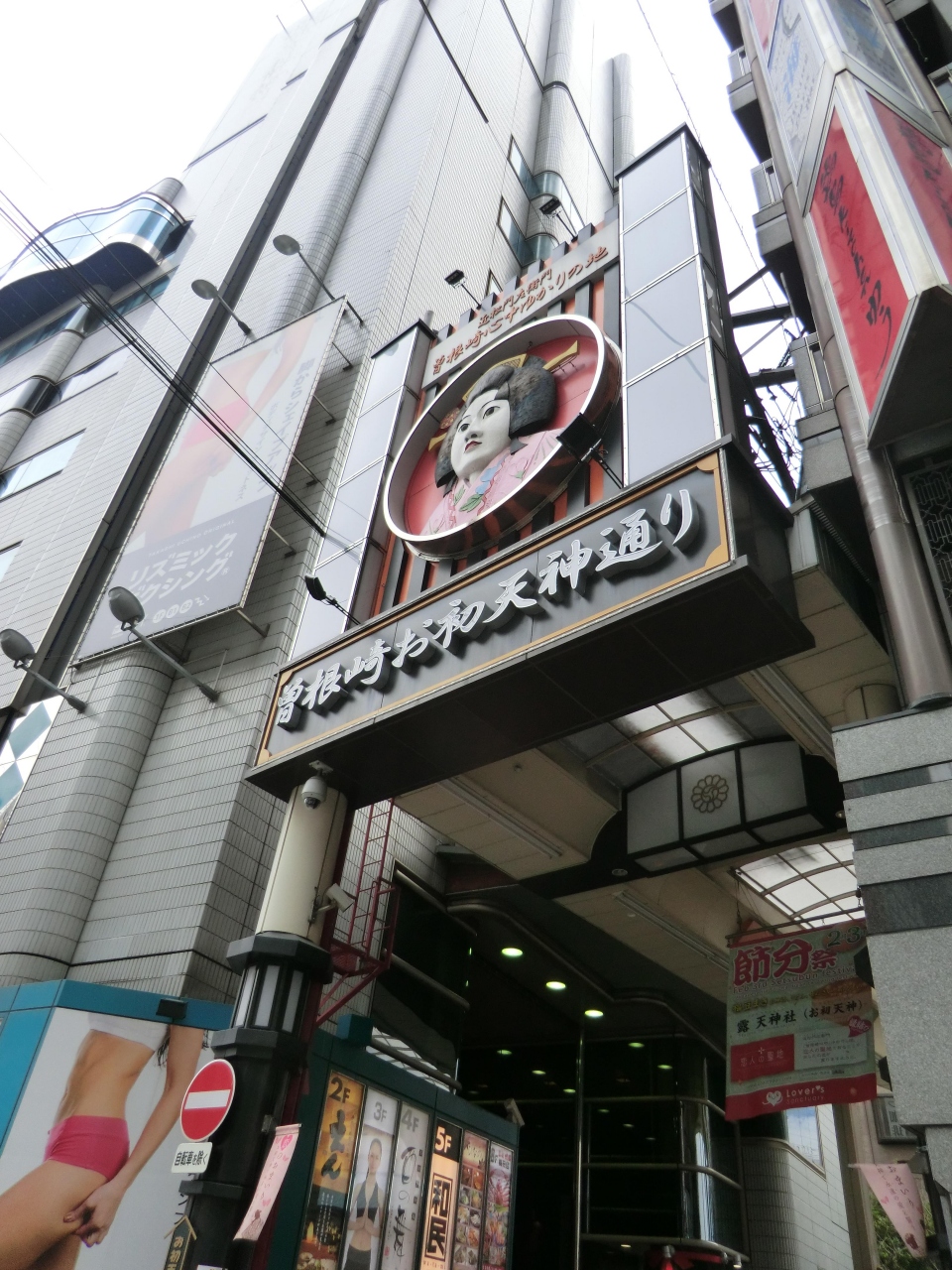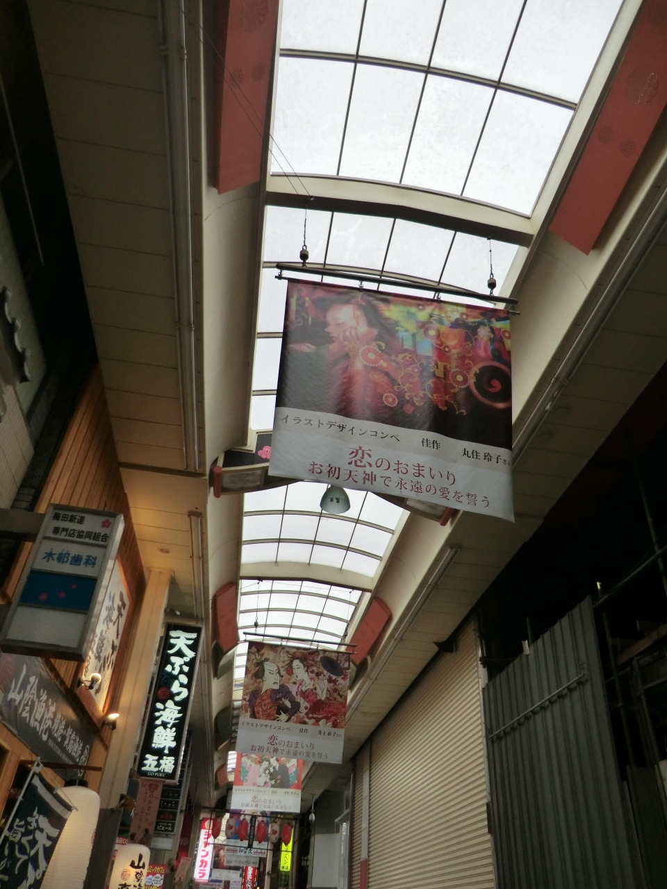 文字通りお初天神まで続く商店街ですが、ほとんど飲食店ばかりです。マクドナルドやドラッグストアもあります。また、昔ながらの「市場」が健在なのにはちょっと驚きました。アーケードにずらっと曽根崎心中を題材にしたイラストの垂れ幕が下がっていましたが、お初天神が恋人の聖地として認定されたのを記念して公募したイラストだそうです。