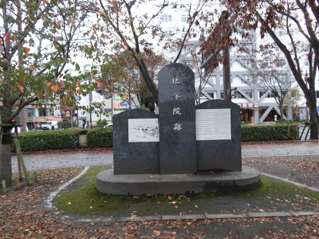 中央公園の隅にあり、今でいう医学や薬学を目指すものに、身分の関係なく誰でも学べる画期的な施設だったそうです。公園内のすぐ近くには、造士館、演武館あとなどの碑も