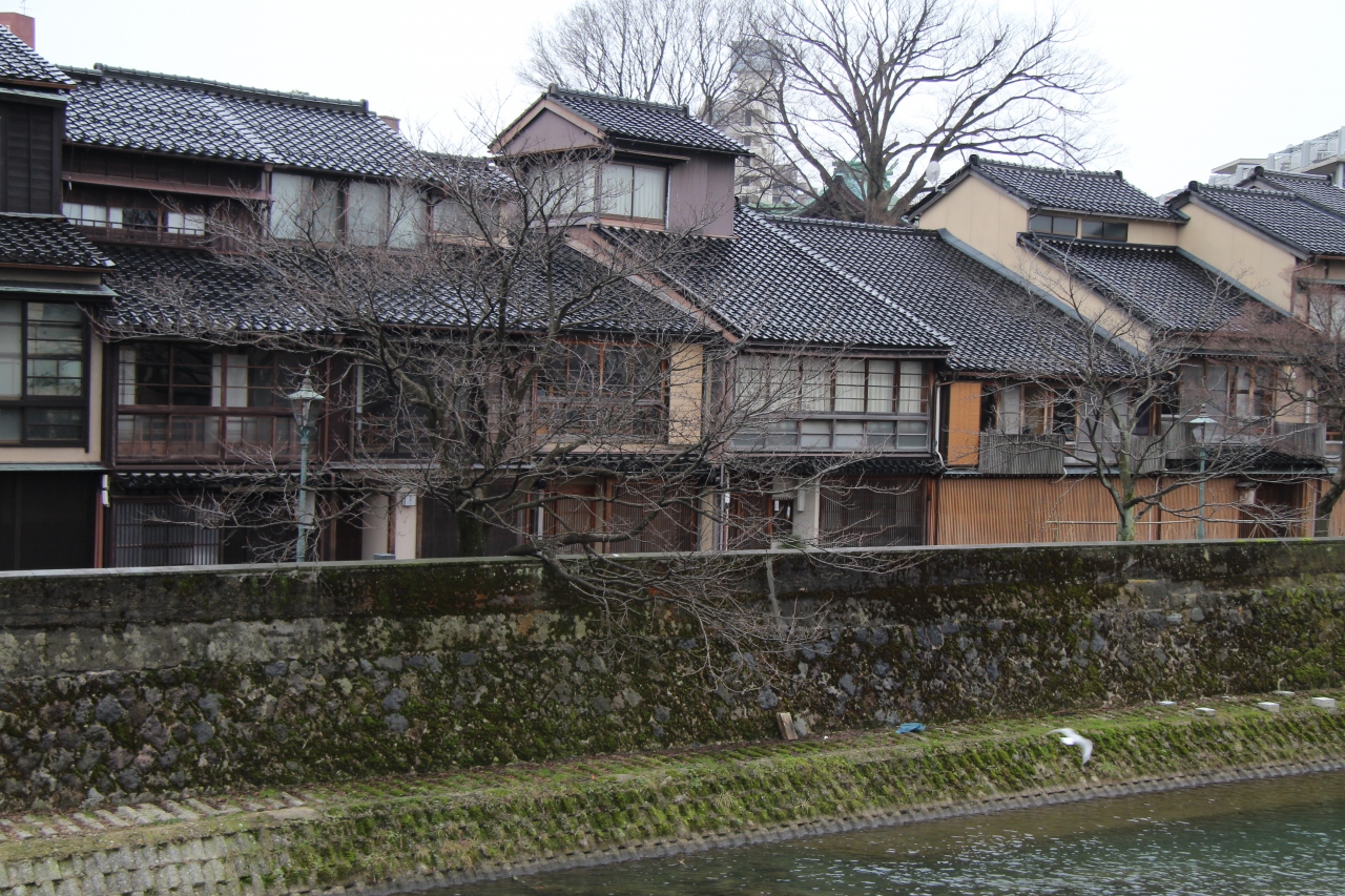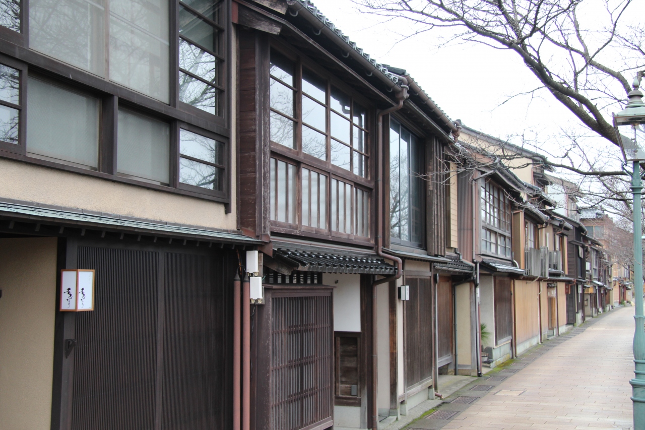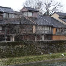 主計町茶屋街は、浅野川大橋から中の橋までの浅野川左岸にあります。ひがし茶屋街からも歩いてすぐです。200m足らずの通りに格子の建物が並んでいます。早朝に行きましたのでほとんど人がおらずとても静かでした。川沿いの風情ある町です。