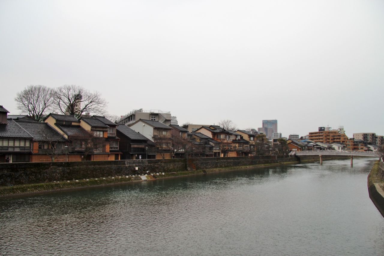 浅野川の右岸の近くに金沢の観光スポットとなっているひがし茶屋街、反対側の左岸沿いには主計町茶屋街があり、川沿いは風情があります。また、3経間連続固定アーチ構造の浅野川大橋や歩行者専用の中の橋、梅の橋が架けられていて橋を見るのも楽しみです。
