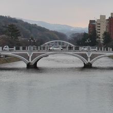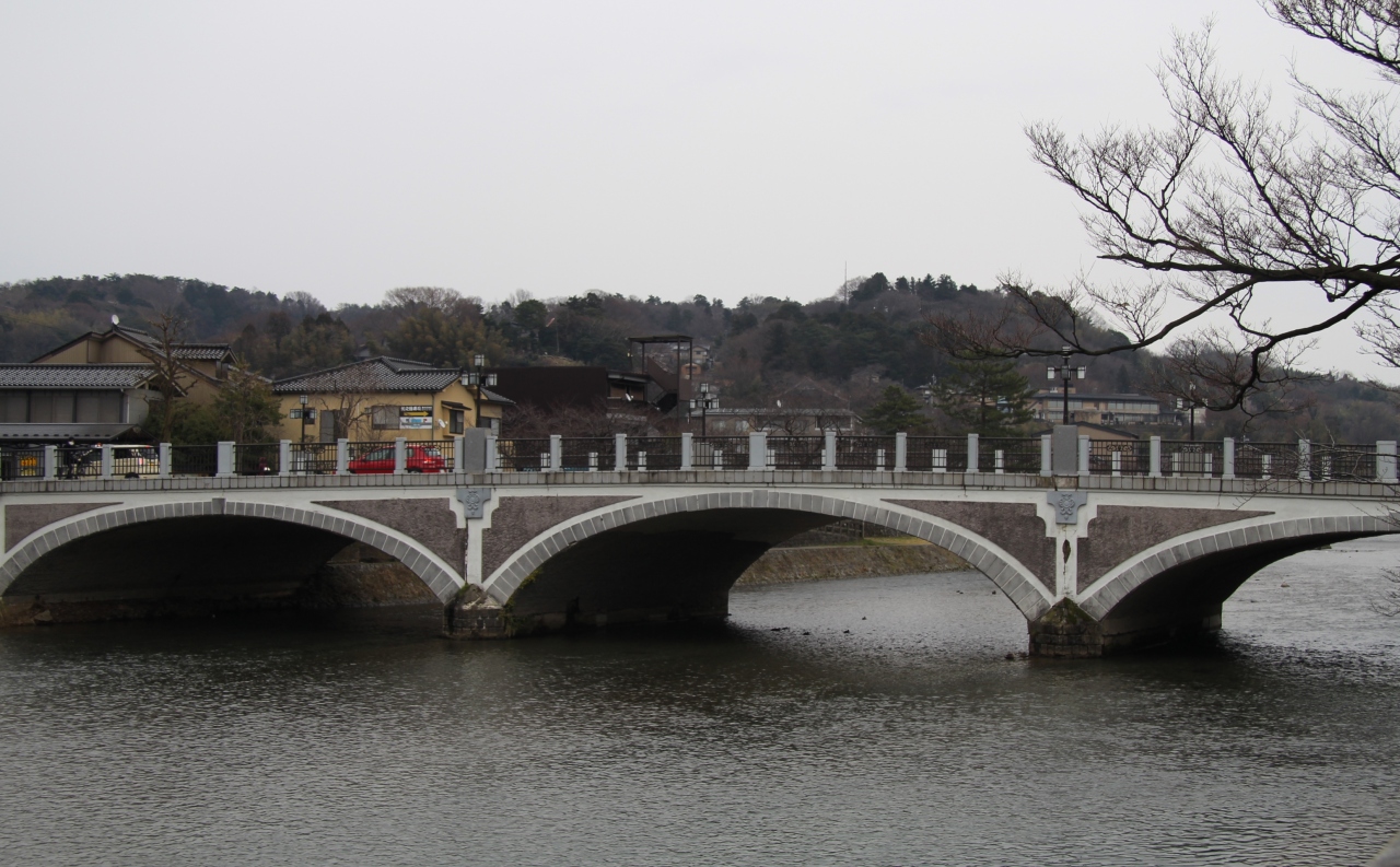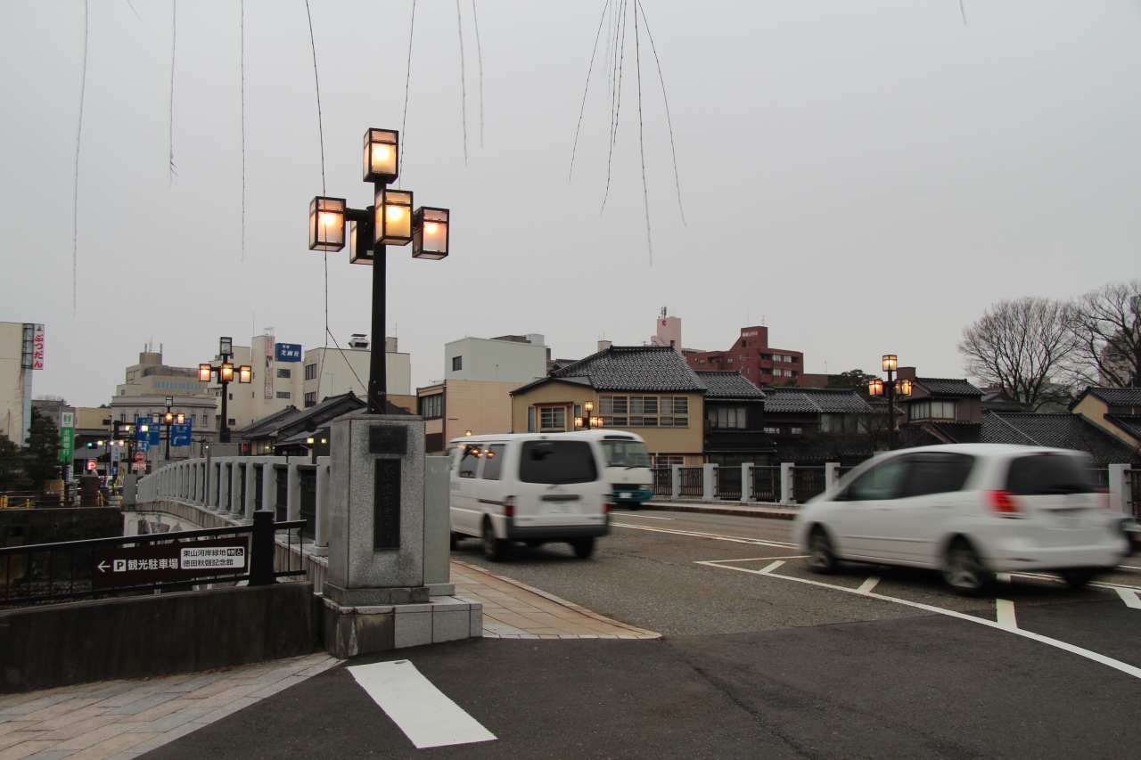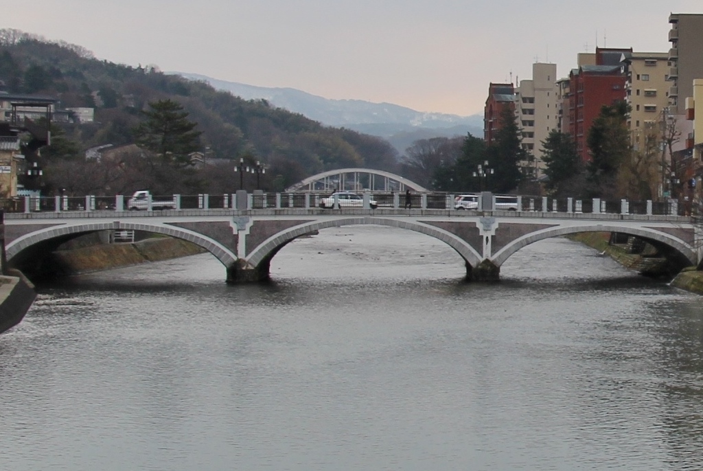 浅野川大橋は金沢市内を流れる浅野川に架かる橋で国道159号、359号の一部ともなっています。前田利家が北国街道に架けたのが始まりのようです。現在のものは大正時代に架けられた3経間連続固定アーチ構造の洒落た形状です。また、照明や高欄なども復元されています。