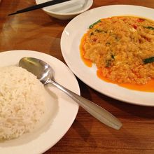 卵と海老カレーはメニューに辛さマークがついてなかったですが辛くご飯はジャスミンライスです固めですが、それほど癖がなく食べやすかったです。セットでついているサラダは玉ねぎかドレッシングがピリッとして少しから目で美味しかったです。