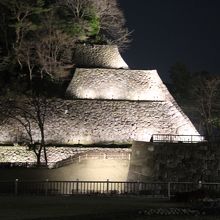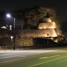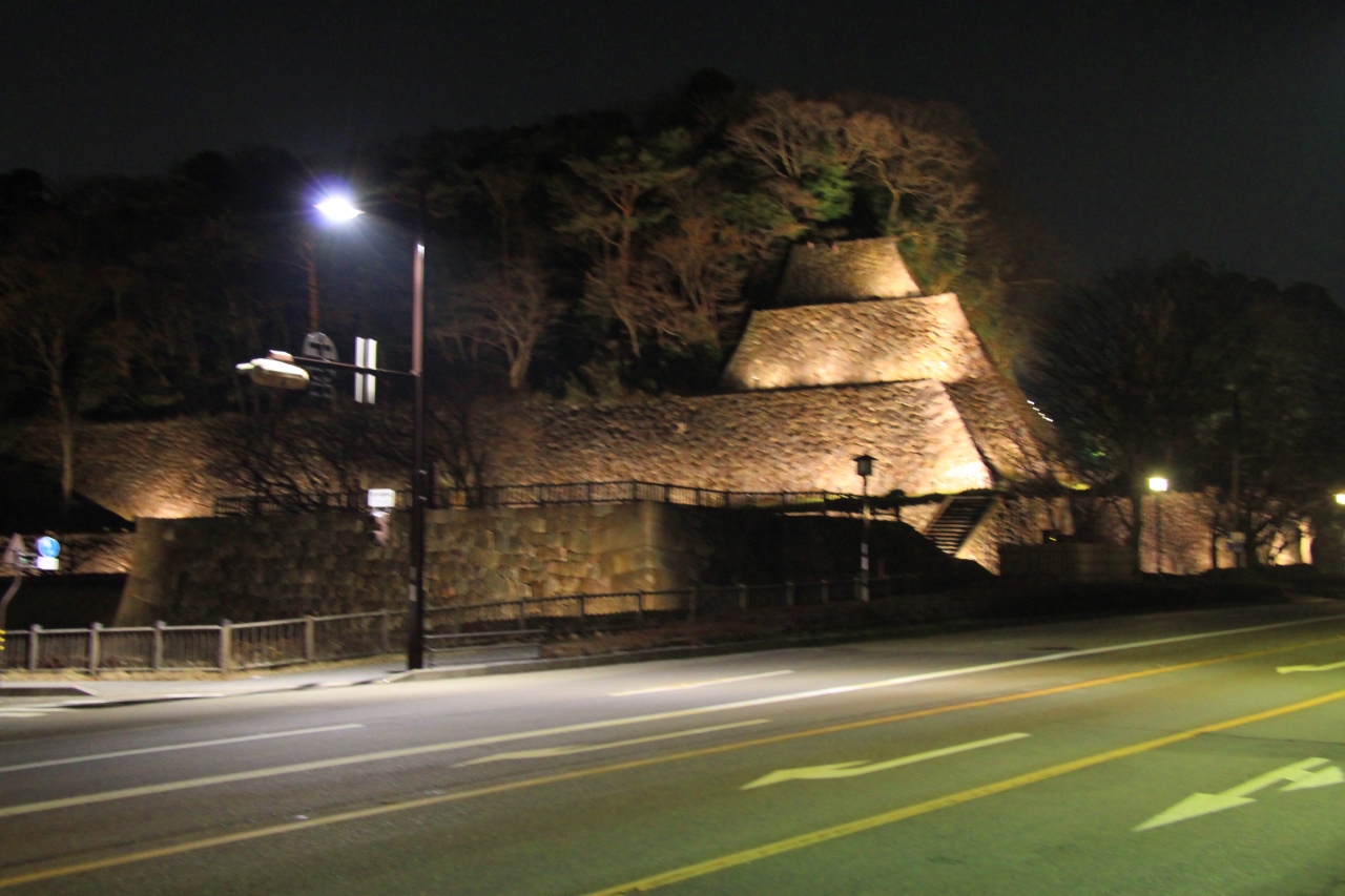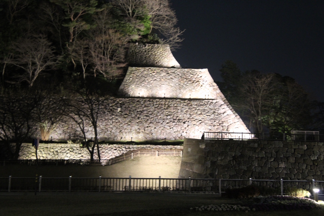 金沢城の南東(辰巳)の角にある3段に積まれた石垣が辰巳櫓跡です。石垣の最上部は下の道路から30m以上の高さにあり見上げる感じです。戦略上重要な櫓の石垣が階段状とは変ですが、明治時代に石垣が崩れ今の形に復元したためのようです。当初はほかの城と同様急勾配の石垣だったようです。ここも夜間はライトアップされていました。