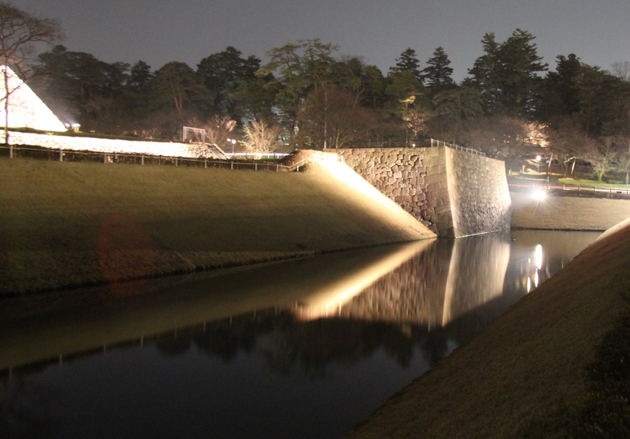 金沢城は以前金沢大学のキャンパスでしたが、同大学が移転してから河北門、菱櫓、五十間長屋、橋爪門続櫓、いもり堀などが復元されました。更にもうすぐ橋爪門二の門、玉泉院丸庭園が復元されます。今回は公園内部を見る時間がありませんでしたが、ライトアップされた石垣を見てきました。