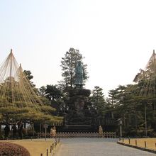お花松は兼六園の明治紀念之標の左右に立っている赤松です。明治時代に同標が建立された際、京都の東西本願寺からて向けられたそうです。右側がお東、左側がお西からの松ということです。どちらの松も雪吊りがなされていて綺麗です。